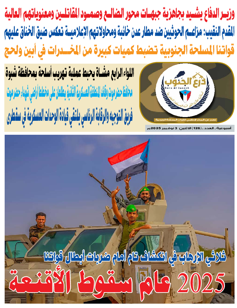 تصفح العدد (126) من صحيفة (درع الجنوب) الصادر اليوم الاثنين الموافق 3 نوفمبر 2025م |
