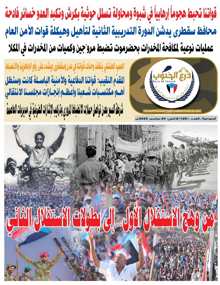 تصفح العدد (129) من صحيفة (درع الجنوب) الصادر اليوم الاثنين الموافق 24 نوفمبر 2025م |