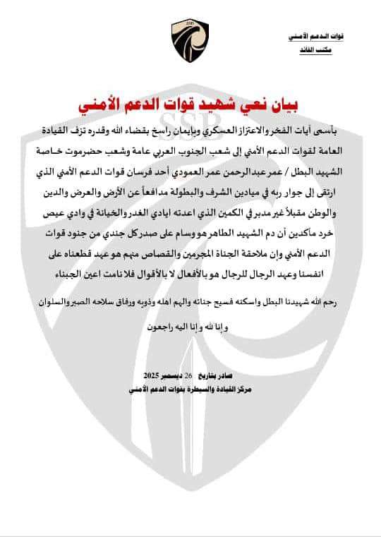 بعث وزير الدولة، محافظ العاصمة عدن أحمد حامد لملس، برقية تعزية ومواساة في وفاة مدير مصلحة الدفاع المدني بالعاصمة سلطان سالم مجاهد الذي انتقل إلى جوار ربه أثر تعرضه لذبحة صدريه اليوم الأربعاء، بعد حياة حافلة بالعمل والعطاء والانجاز.