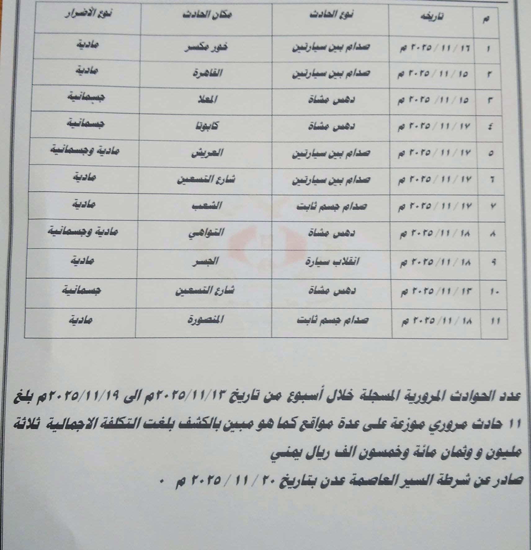 وخلال الفترة ذاتها، شهدت العاصمة 11 حادثاً مرورياً أسفرت عن إصابات تفاوتت بين الطفيفة والمتوسطة، إضافة إلى خسائر مادية قُدّرت بـ ثلاثة ملايين وثمانمائة وخمسين ألف ريال يمني.