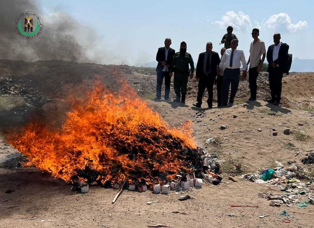 بإشراف النيابة العامة والعميد الوالي.. الادارة العامة لمكافحة المخدرات بقوات الحزام الأمني تُتلف كمية كبيرة من الحبوب المخدرة