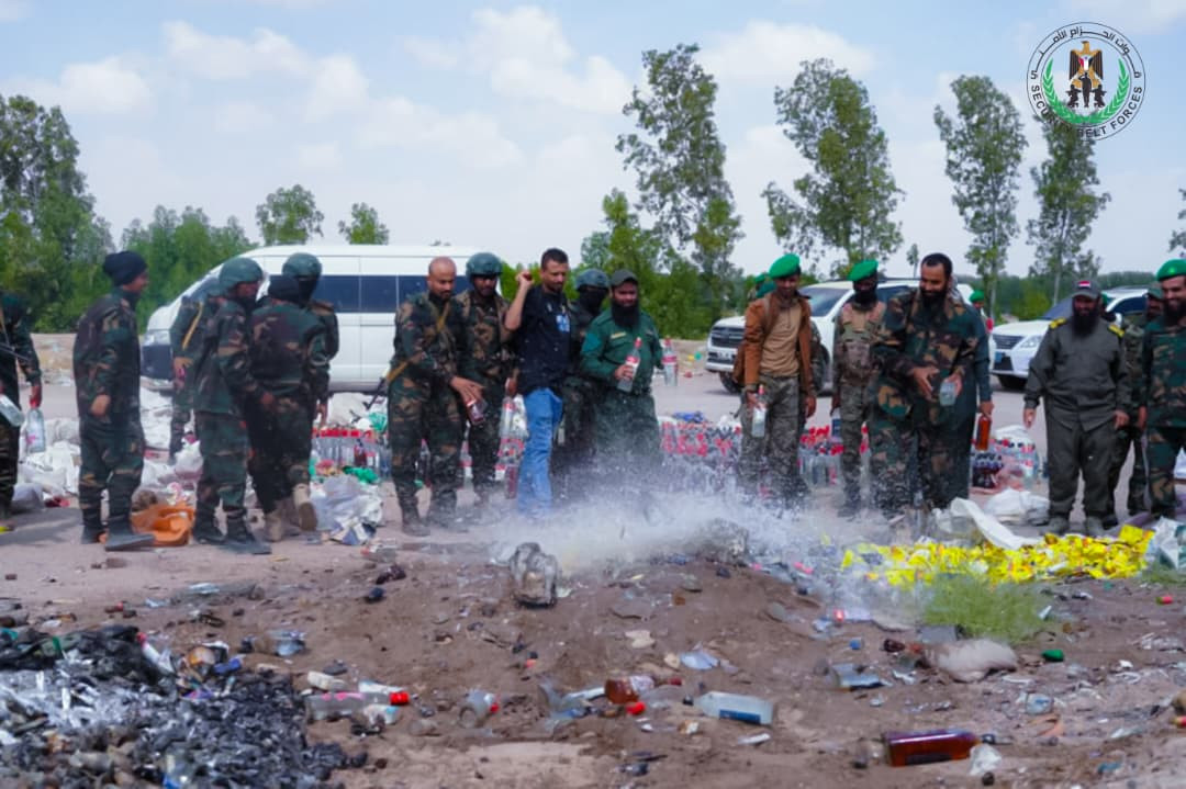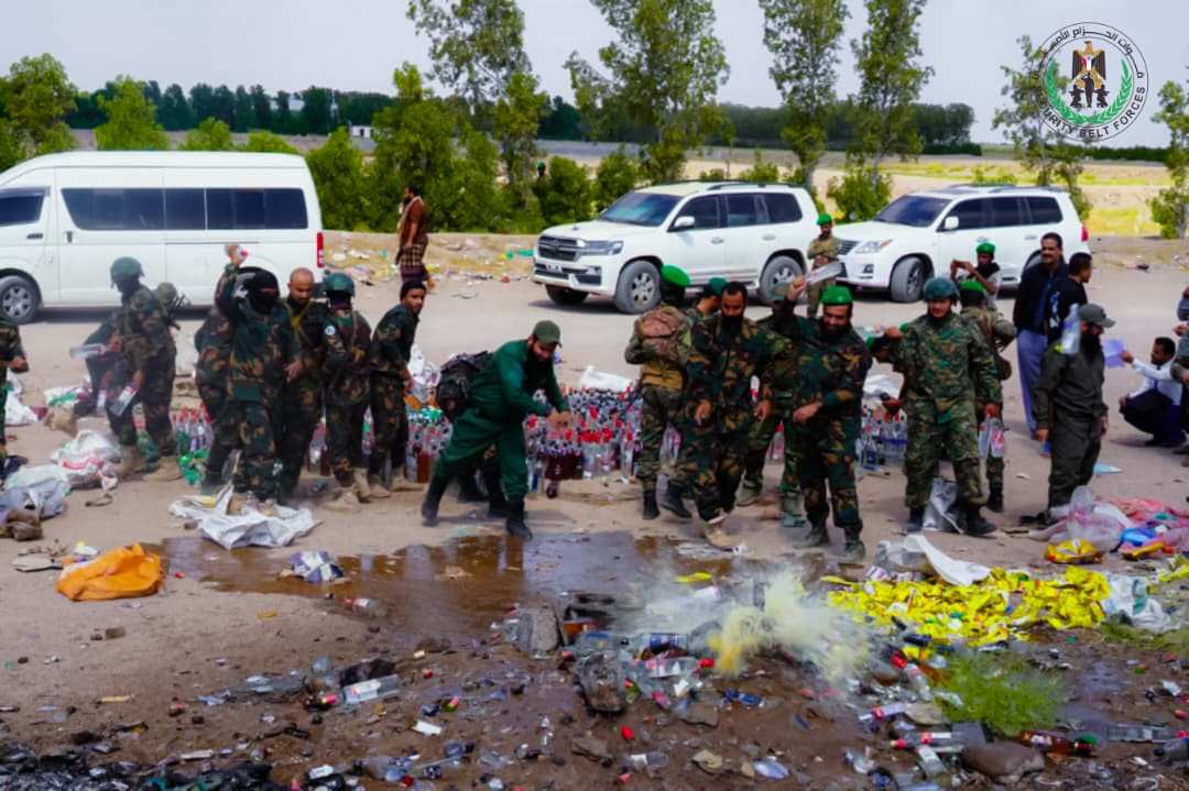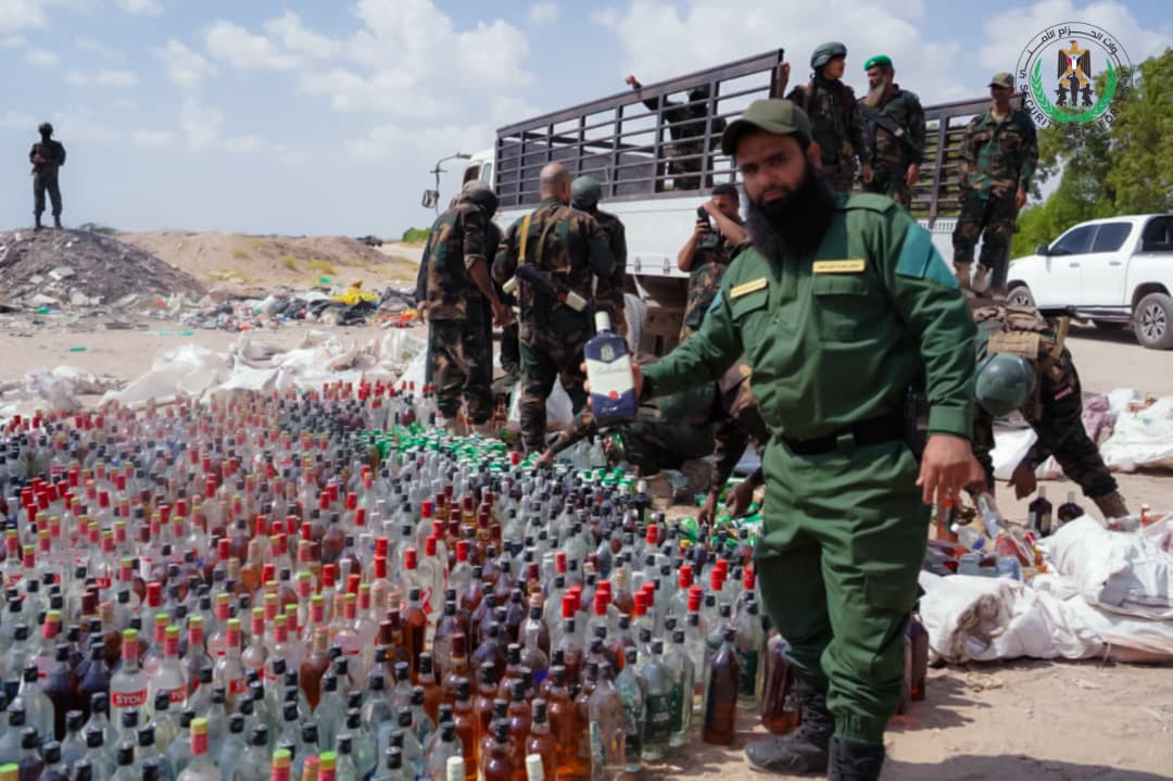 أتلفت الإدارة العامة لمكافحة المخدرات بقوات الحزام الأمني، صباح اليوم، كمية كبيرة من الخمور المستوردة بلغت (1762) قارورة وعلبة، تم ضبطها في وقت سابق من قبل قوات حزام طوق العاصمة عدن في منطقة رأس عمران، على أحد خطوط التهريب الصحراوية.