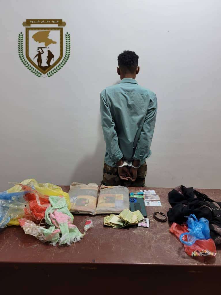تمكنت قوات دفاع شبوة اللواء الثاني في احد مداخل مدينة عتق من القاء القبض على المدعو (ب.ا.ا.ي) وبحوزته كمية من مادة الحشيش ال...