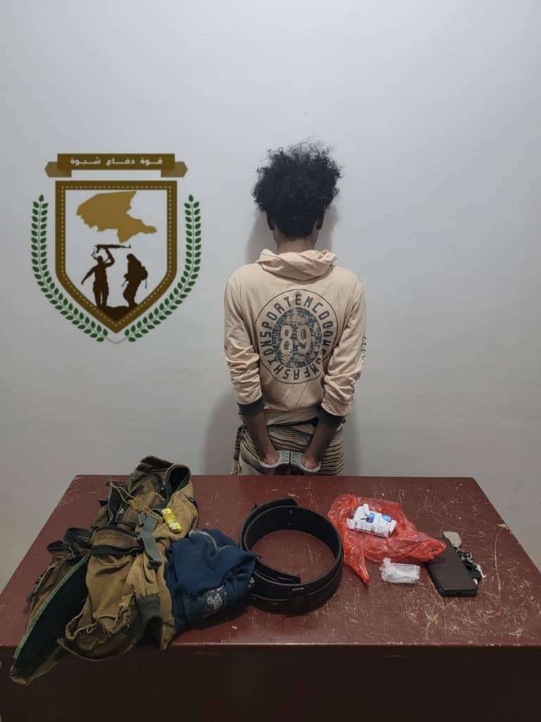 تمكنت قوات دفاع شبوة اللواء الثاني في احد مداخل مدينة عتق من إلقاء القبض على المدعو (ج.ط.م.ح) وبحوزته كمية من مادة الشبو المخدر &...