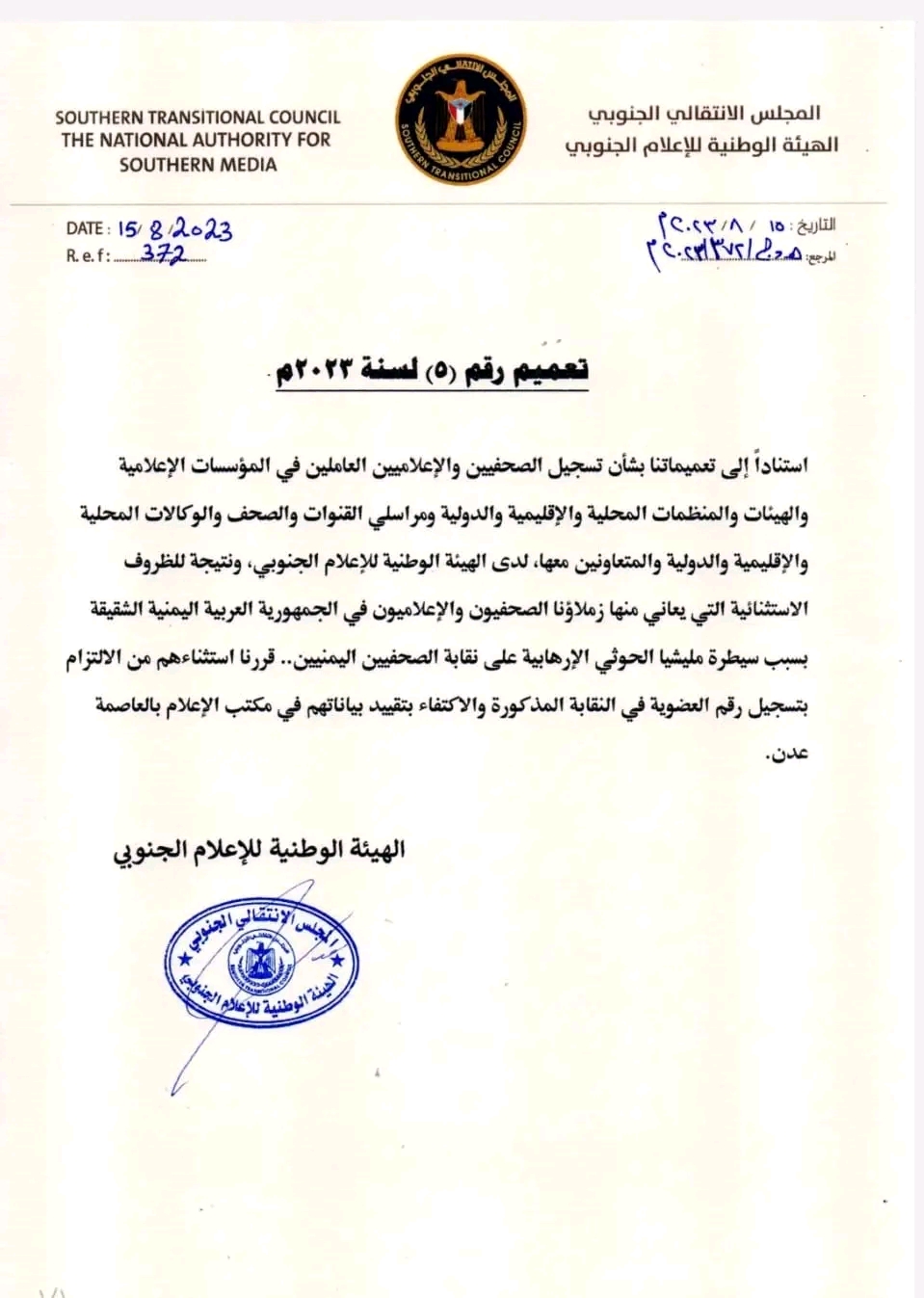 أصدرت الهيئة الوطنية للإعلام الجنوبي التعميم رقم (5) لسنة 2023 م بشأن تسجيل الزملاء الصحفيين والإعلاميين من اليمن الشقيق و...