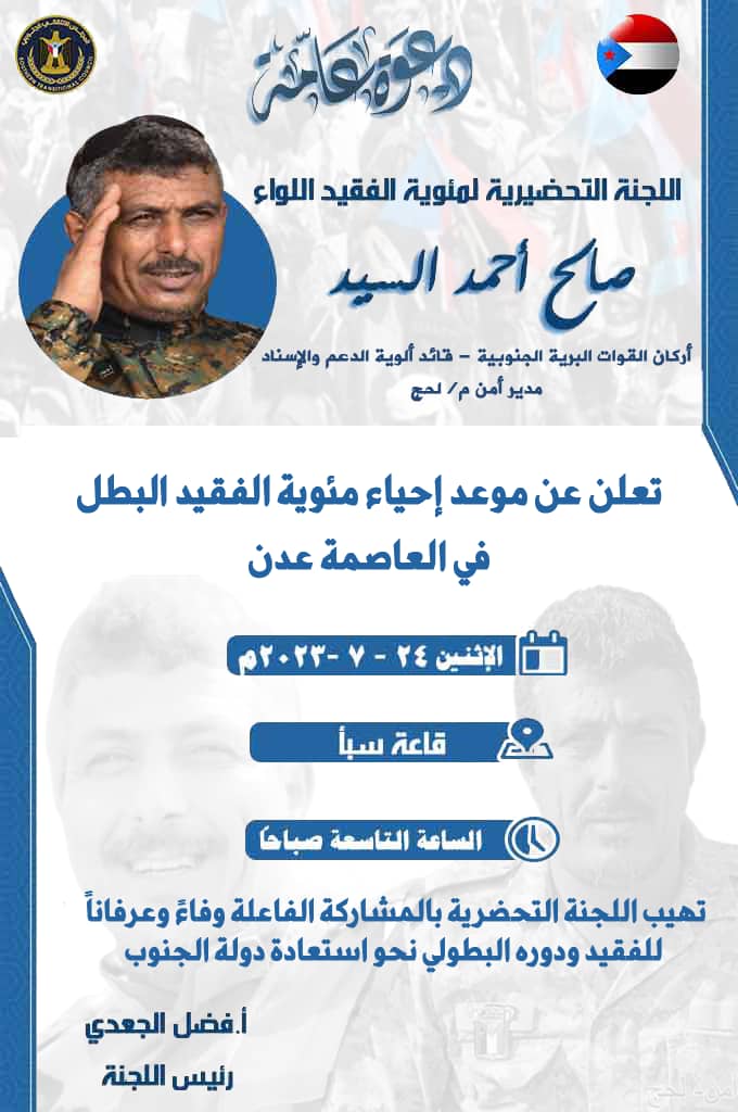 أعلنت اللجنة التحضيرية لمئوية الفقيد القائد الجسور اللواء صالح السيد عن موعد إقامتها يوم الأثنين القادم في الرابع...