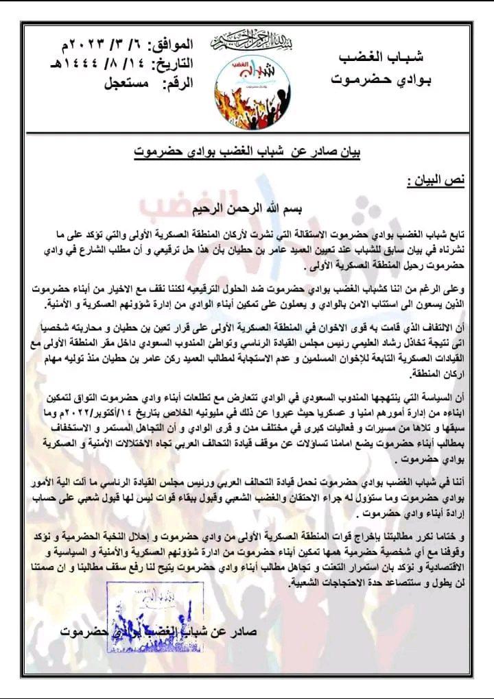 نص البيان : بسم الله الرحمن الرحيم . تابع شباب الغضب بوادي حضرموت الاستقالة التي نشرت لأركان المنطقة العسكرية الأولى وال...