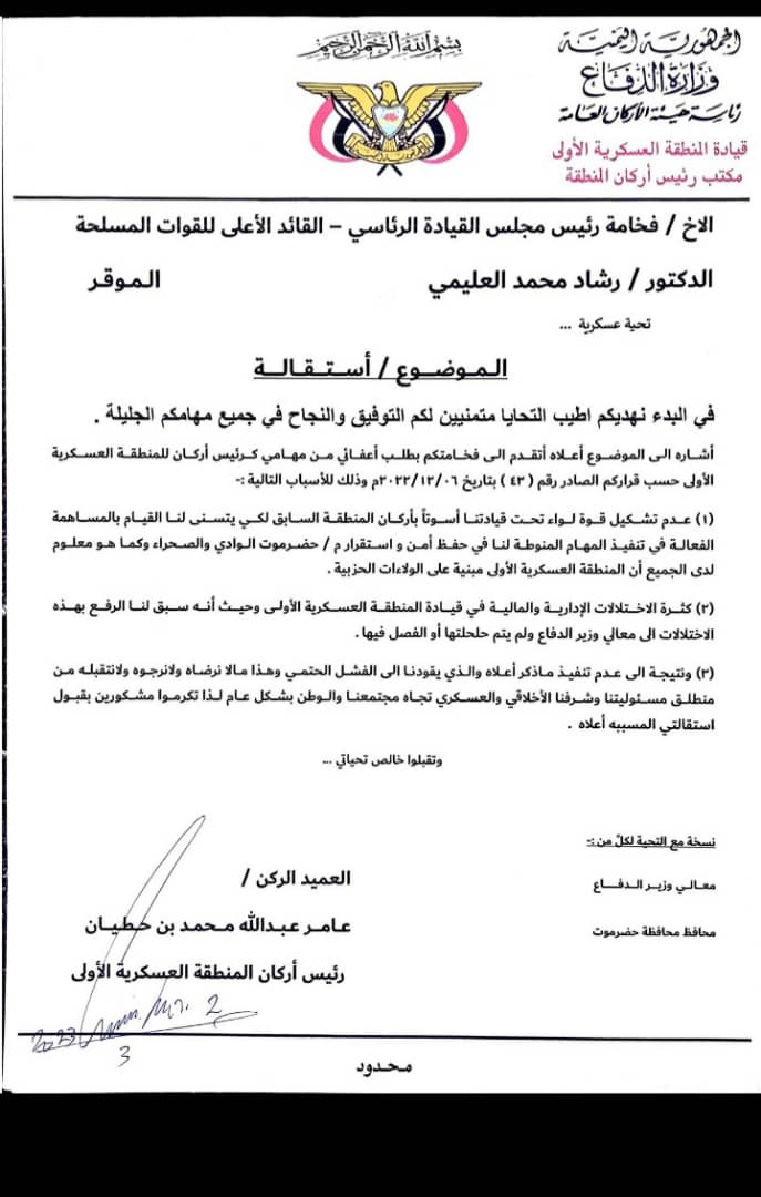 قدّم رئيس أركان المنطقة العسكرية الأولى بوادي حضرموت المعين حديثاً, العميد الركن عامر بن حطيان النهدي استقالته لرئيس مجلس...