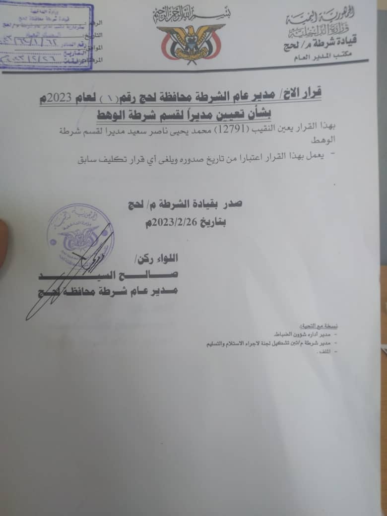 أصدر اللواء صالح السيد مدير أمن مـحافظة لحج أمر إداري بتعيين مديراً لقسم شرطة منطقة الوهط بمديرية تبن لحج. ونص...