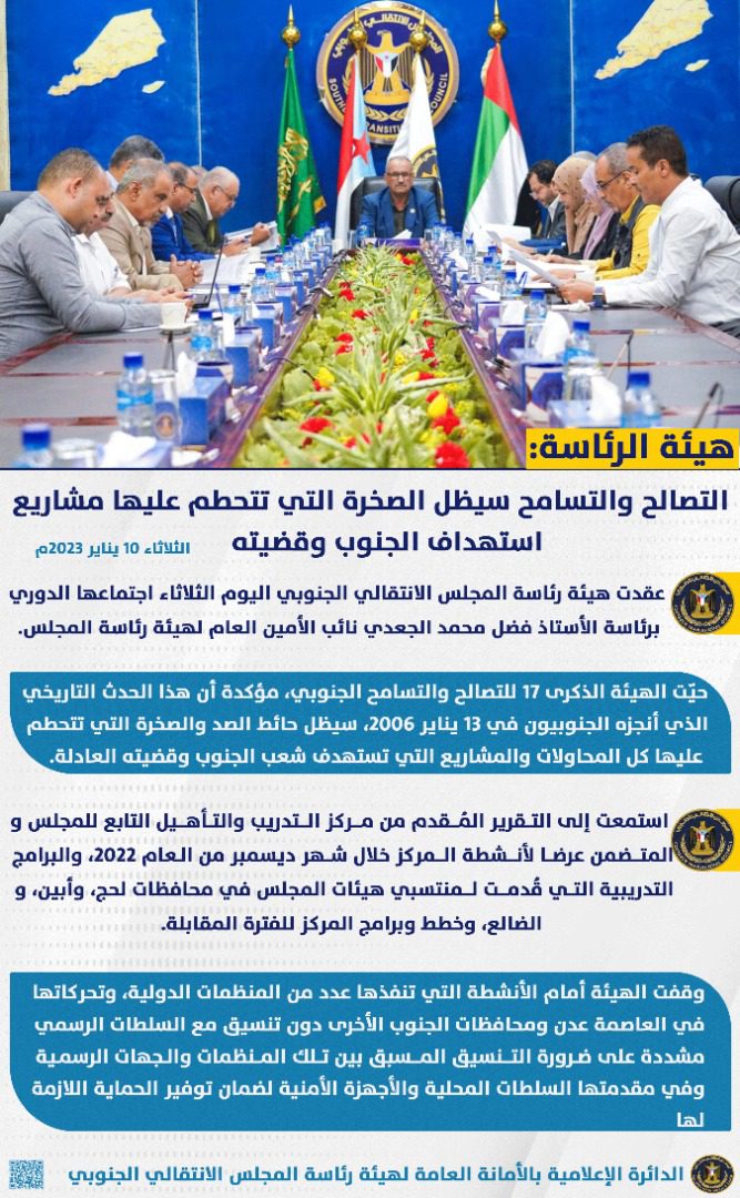 عقدت هيئة رئاسة المجلس الانتقالي الجنوبي، اليوم الثلاثاء، اجتماعها الدوري برئاسة الأستاذ فضل محمد الجعدي نائب الأمين العام...