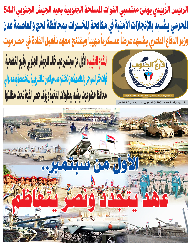تصفح العدد (118) من صحيفة (درع الجنوب ) الصادر اليوم الاثنين الموافق 1 سبتمبر 2025م |