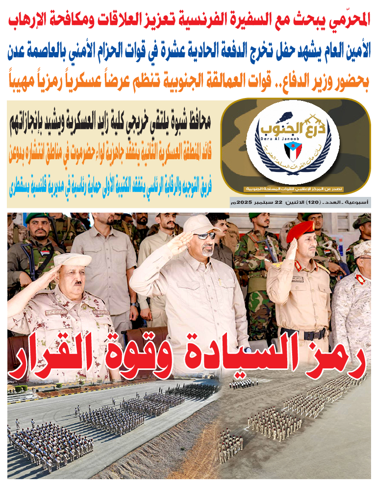 تصفح العدد (120) من صحيفة (درع الجنوب ) الصادر اليوم الاثنين الموافق 22 سبتمبر 2025م |