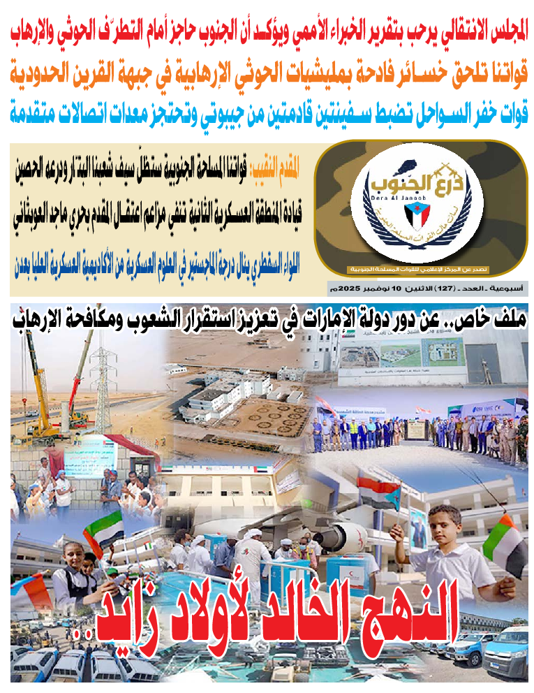 تصفح العدد (127) من صحيفة (درع الجنوب) الصادر اليوم الاثنين الموافق 10 نوفمبر 2025م |