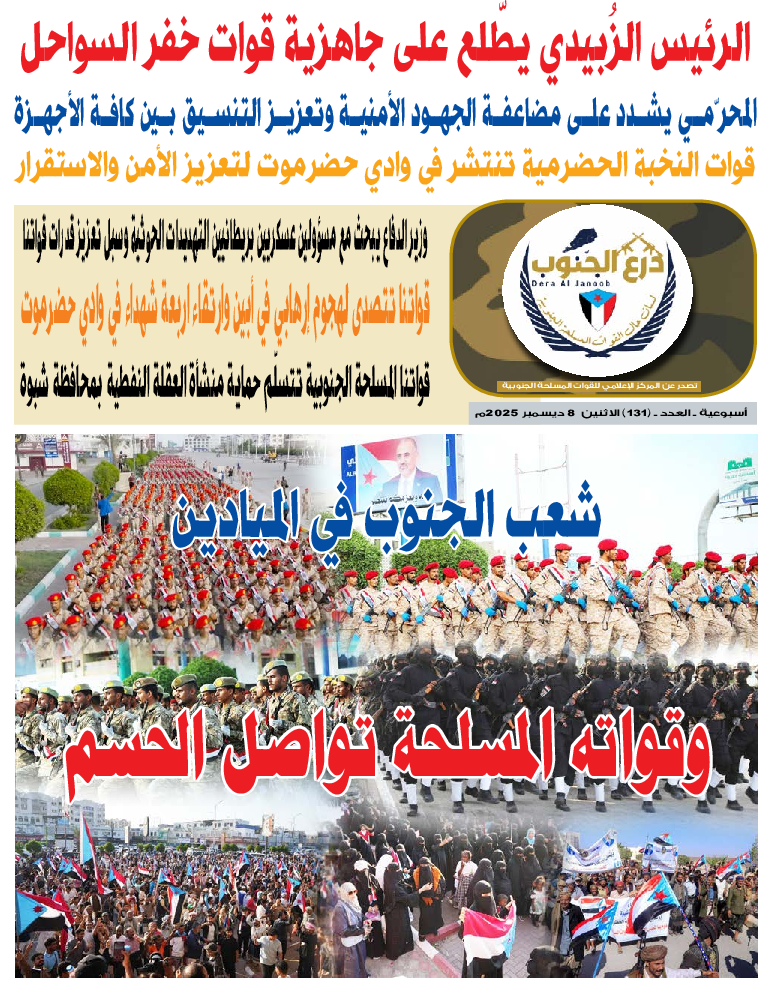 تصفح العدد ( 131 ) من صحيفة ( درع الجنوب ) الصادر اليوم الاثنين الموافق 8 ديسمبر 2025م |