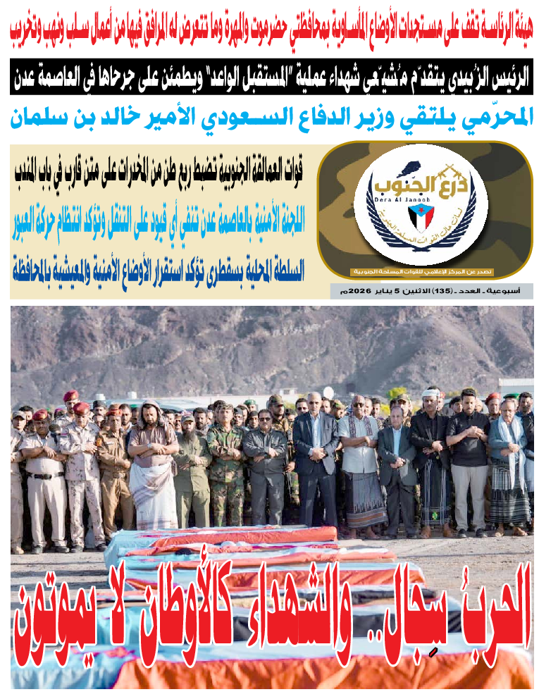 تصفح العدد ( 135) من صحيفة ( درع الجنوب ) الصادر اليوم الثلاثاء الموافق 6 يناير 2026 |