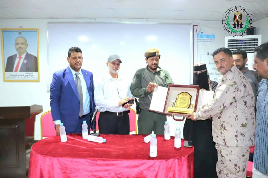 وقدم أركان الحزام الأمني بعدن، العقيد عمار السرحي، درع الشكر والعرفان لكل من الدكتور العميد عارف الداعري، رئيس الهيئة الصحية العليا للقوات المسلحة الجنوبية، و منظمة أطباء بلا حدود ممثلة بالمدير الإقليمي للبعثة مارك شاكال، والمستشفى الألماني ممثلا بمديرها الدكتور محمد العياشي، على دورهم الهام في تقديم الخدمات الصحية لمنتسبي الحزام والقوات المسلحة الجنوبية وكذلك المواطن بشكل عام.