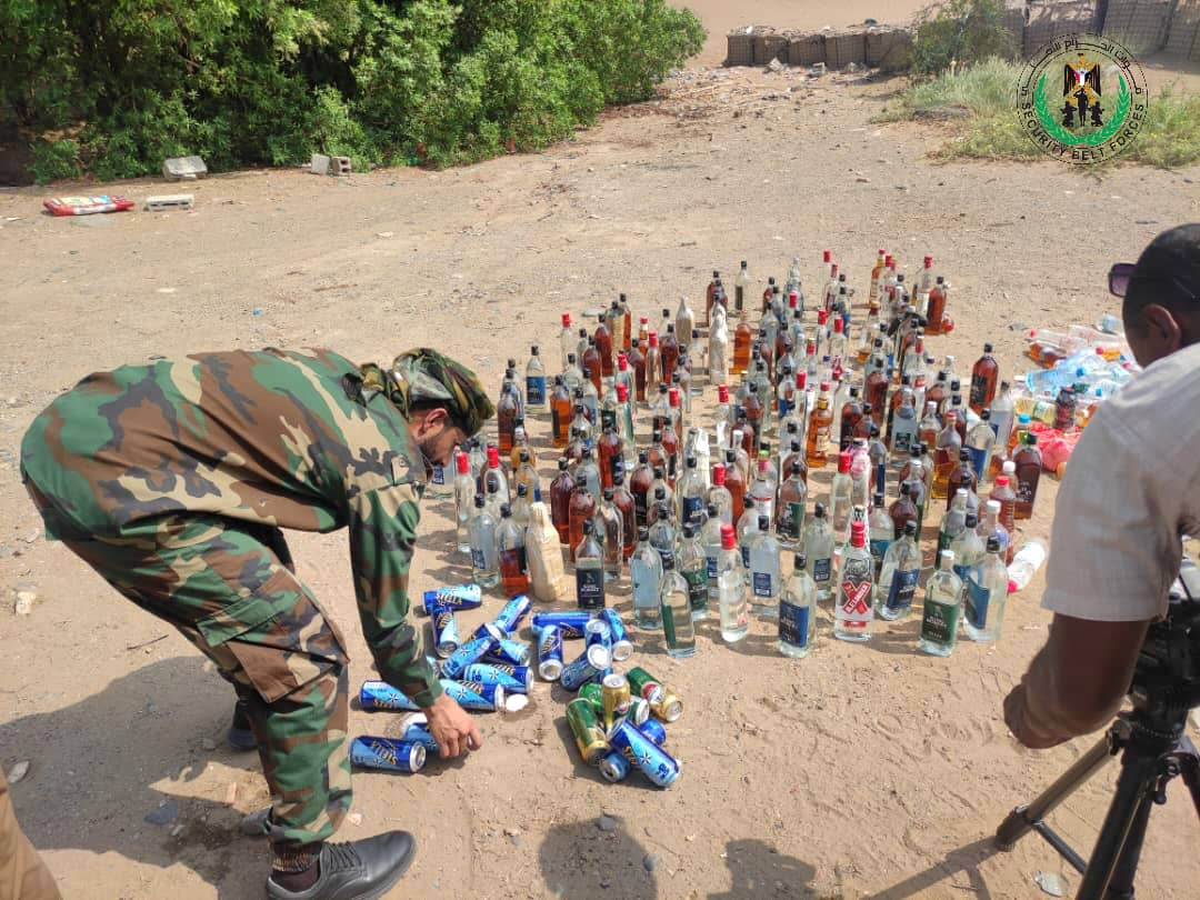 قوات الحزام الأمني بلحج تتلف كمية كبيرة من الخمور