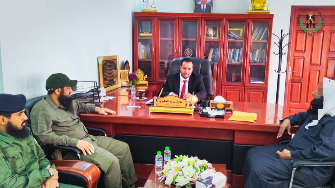 ناقش العميد محسن بن عبد الله الوالي، القائد العام لقوات الحزام الامني، اليوم، مع وزير التربية والتعليم، الأستاذ طارق سالم العكبري، جملة من القضايا المُتعلقة بسير العملية التعليمية، وفي مقدمتها قضايا مدارس تحفيظ القرآن، بالإضافة إلى سبُل تأمين المرافق التعليمية من قبل قوات الحزام الأمني.