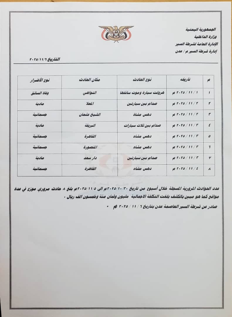 كما سجلت الإدارة خلال ذات الفترة (8) حوادث مرورية نتج عنها عدد من الإصابات تراوحت بين الطفيفة والبليغة، إضافة إلى حالة وفاة واحدة، فيما قُدّرت الخسائر المادية الناتجة عن تلك الحوادث بنحو مليون وثمانمائة وخمسين ألف ريال يمني.